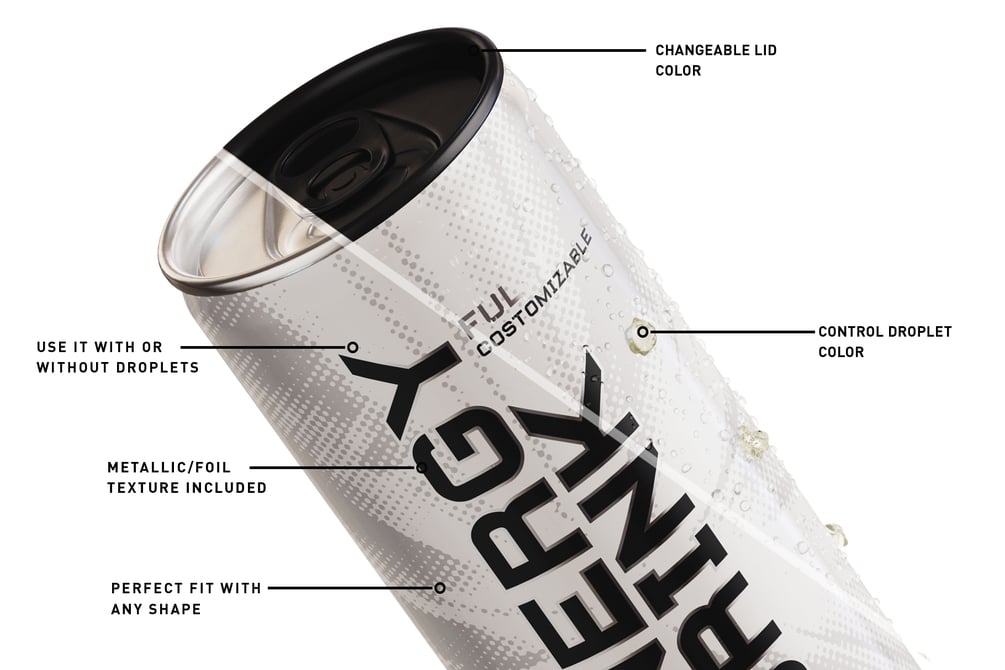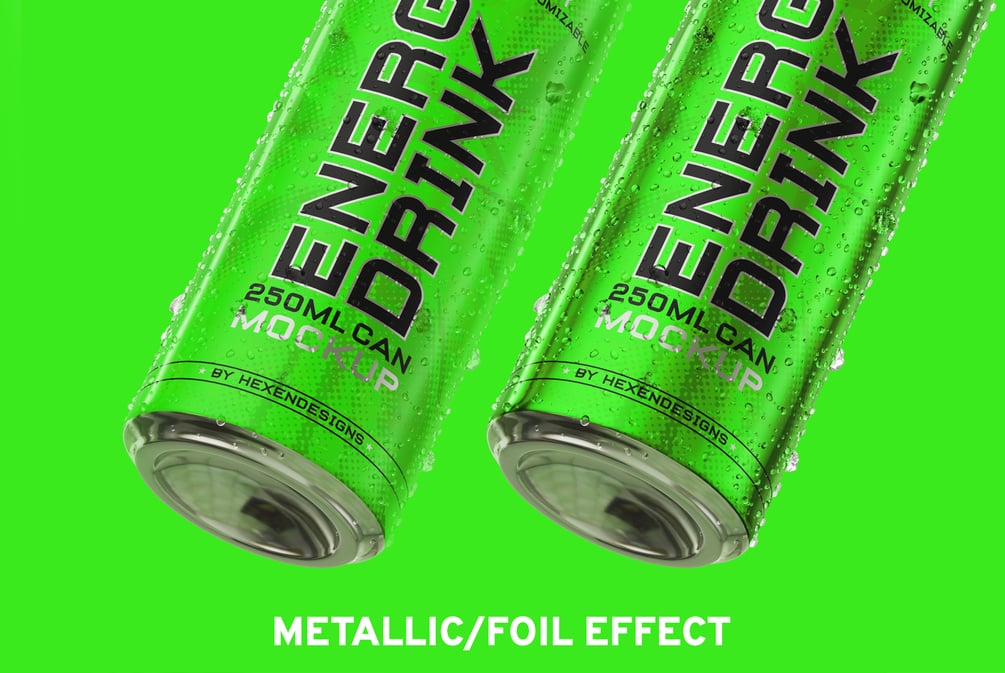 This is an aluminum 250ml PSD energy can mockup that is fully editable through smart layers and is ready to use as a template for all types of drinks, beers, iced beverages, sodas, or coke cans.