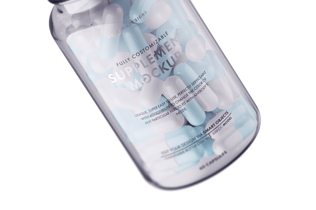 This is a supplement bottle mockup with a size that fits 60 capsules and that is fully editable through smart layers and is ready to use as a template for supplemental products.