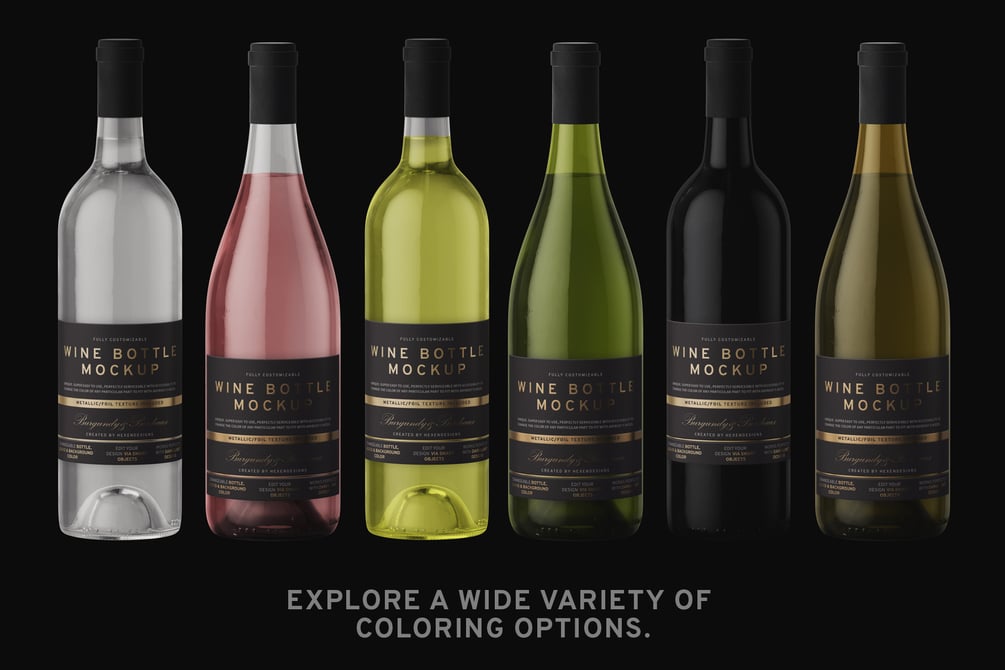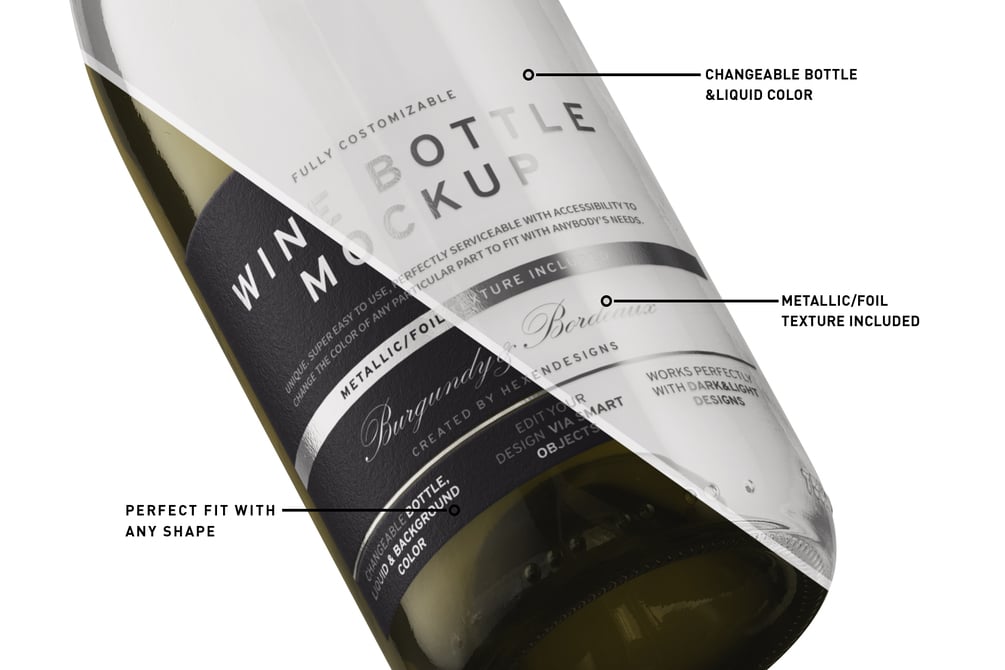 This is a 750ml PSD wine bottle mockup with two different bottle shape that is fully editable through smart layers and is ready to use as a template for wines, liqueurs, vodkas, whiskeys, spirit drinks or any type of beverage.